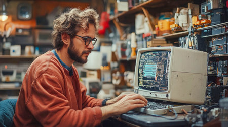A bearded man wearing glasses and a sweater working on an old retro computer in a cluttered workshop filled with vintage electronics and spare parts.