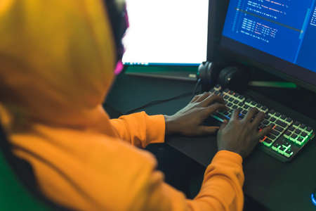 Portrait of an African American guy in yellow hoodie typing on colorful illuminated keyboard, programming, or surfing the internet. High quality photo