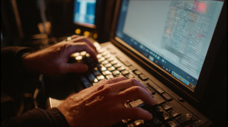 A person is shown working on a computer, the scene illuminated by the screen and keyboard lights. The composition is close-up, featuring the hands and the monitor. The setting seems indoors, possibly a home office, with a soft lighting ambiance. This image is suitable for various commercial uses related to technology and work.