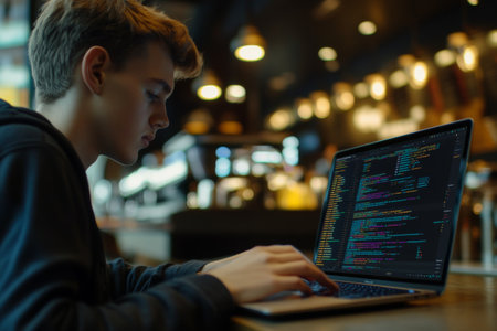 A young data analyst is immersed in remote work at a coffee shop, concentrating on a laptop that displays complex code and colorful data dashboards, capturing the essence of modern work life.