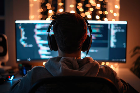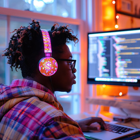 A young adult focused on coding at a computer desk, wearing colorful headphones in a warm, inviting atmosphere.