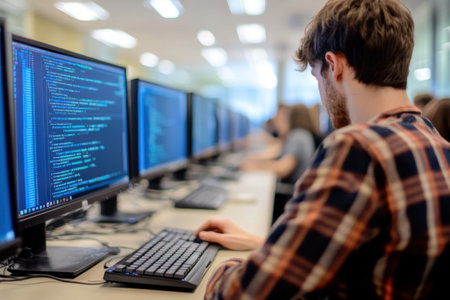 A focused student works on programming tasks using multiple monitors in a busy computer lab.