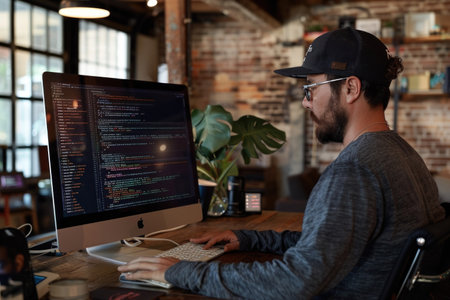 Young software engineer in modern loft office, focused on coding new project with multiple screens, showing determination.