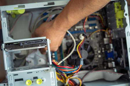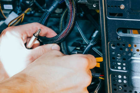 Close-up of hands of young computer engineer fixing broken pc parts at the desk in the home office