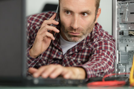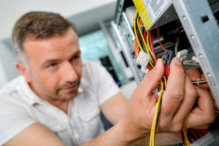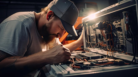 awesome computer repair technician repair hardware indoors, close up side view photo,