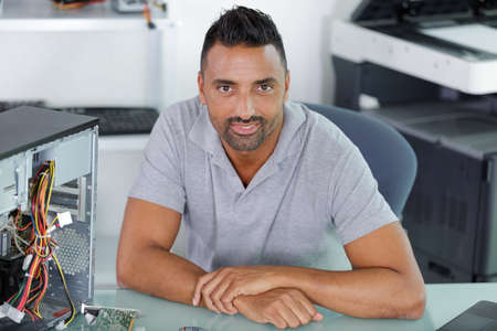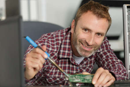 awesome happy man enjoying working with broken computers, favourite job. man has found the reason of broken PC