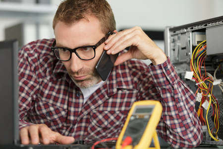 man calls repairman on phone, tries to fix computer himself and install cooler.