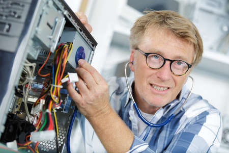 Senior male tech works in hardware repair facility.guy is assembling a computer.