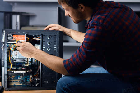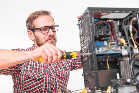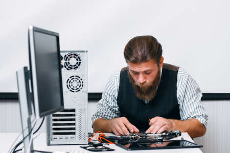 Bearded engineer assembling computer at workplace. Repairman fixing computer inside circuit in office. Electronic renovation, technology, business concept