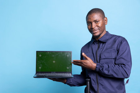 Smiling security guard pointing at his laptop with isolated copyspace, showing a greenscreen while he poses against blue background. Young trained agent wearing his uniform for patrol service.