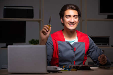 Young repairer computer, working with screwdriver in service center. Generative AI