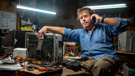 A bearded man wearing glasses and a sweater working on an old retro computer in a cluttered workshop filled with vintage electronics and spare parts.