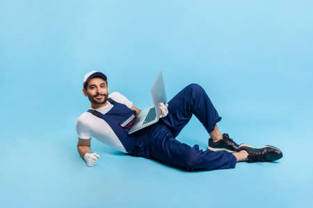 Full length handsome professional handyman in uniform lying sexy, posing on camera and smiling, holding laptop for online customer support, contact center of repair service. studio shot isolated