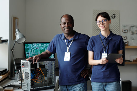 Two successful engineers of repair service center looking at camera while young woman using tablet and mature man touching processor
