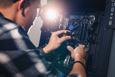 view from behind. computer workshop. repairman installs a cooler in a computer