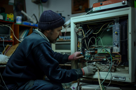 A TV repairman fixing a television set showcasing electronics repair abilities