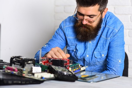Smart professional. Bearded man repair circuit board. Engineer or technician at work. Bearded hipster works on fixing digital hardware. Assemblying of electronic devices. New technology and science.