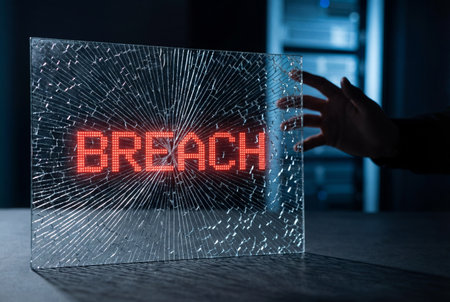 A glowing red digital breach warning appears on a shattered glass pane while a human hand reaches out from the shadows of a dark server room filled with network equipment.
