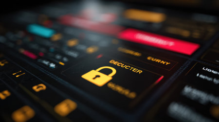 A visually striking laptop screen displays a bright red lock icon over abstract lines of code, symbolizing cybersecurity and protection.