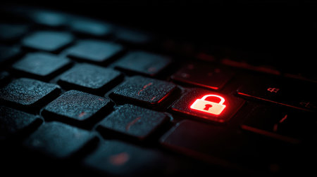 Close-up view of a dark keyboard with a red lock symbol highlighting the importance of internet security and data protection in the digital age
