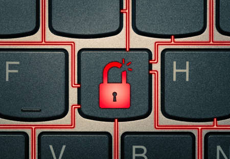 Key on a keyboard with broken lock icon. Cyber attack and Identity theft. Concept.