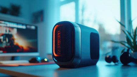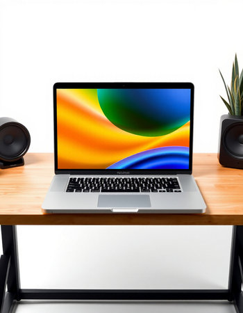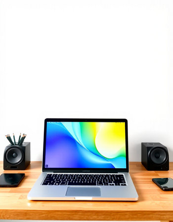 A sleek laptop sits between two speakers, illuminated by vibrant pink and blue lighting, creating a modern, tech-inspired atmosphere.