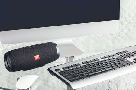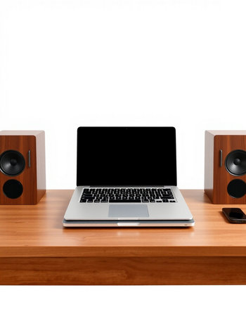Workstation with speakers and computer in studio. Desktop in home office. Selective focus on the speaker.
