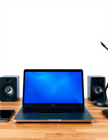 Laptop with blue screen on wooden desk with speakers and microphone.