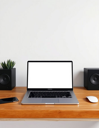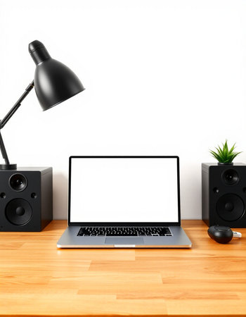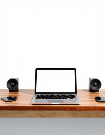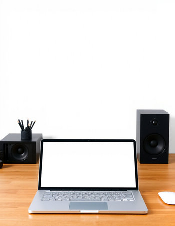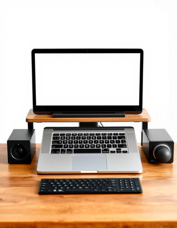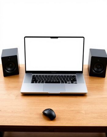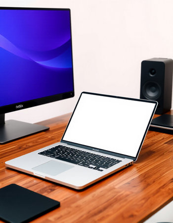 Laptop with blank screen on wooden desk in front of computer monitor and speakers