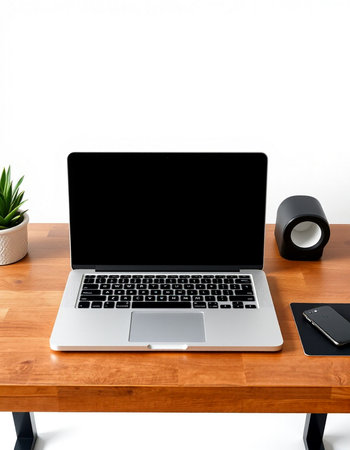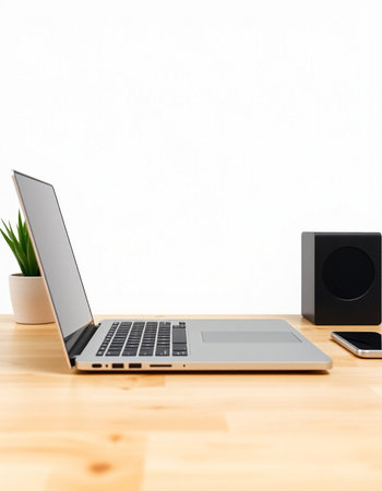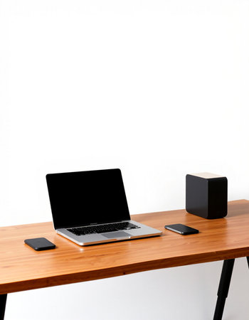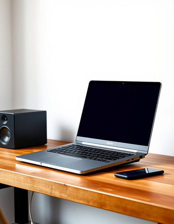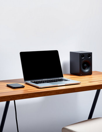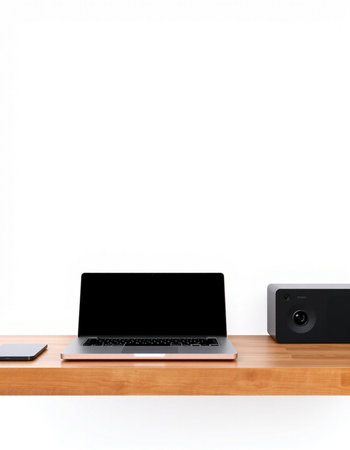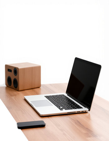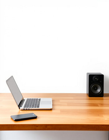 Laptop on wooden desk with speaker and mobile phone on white wall background