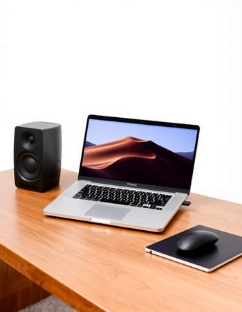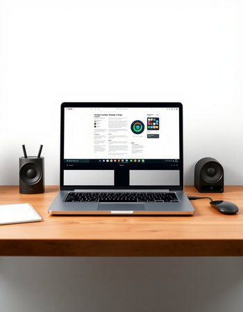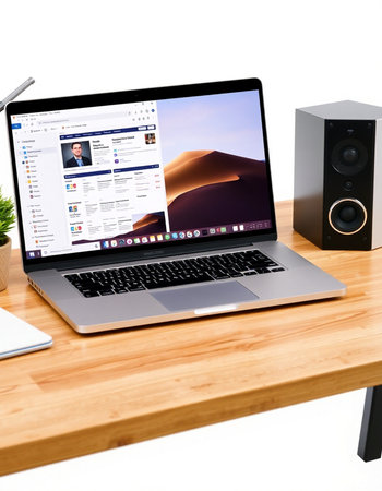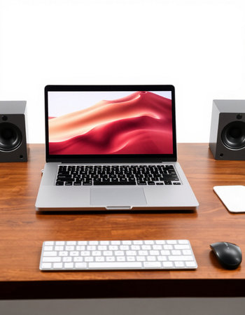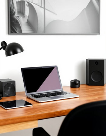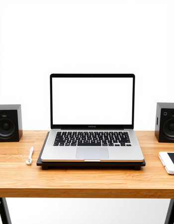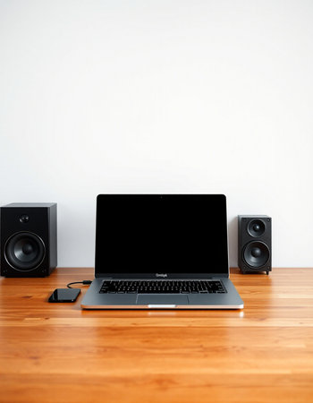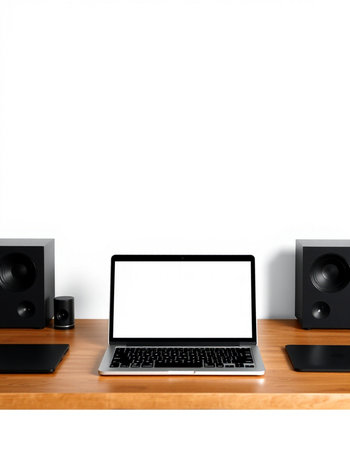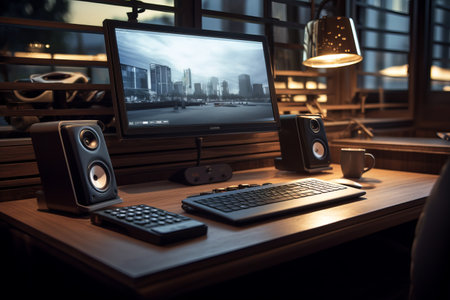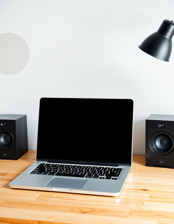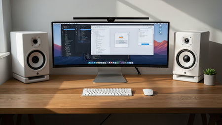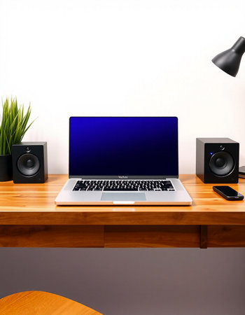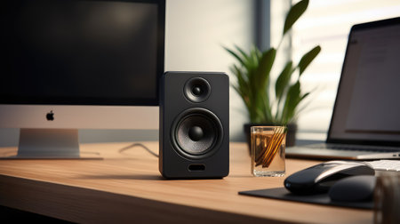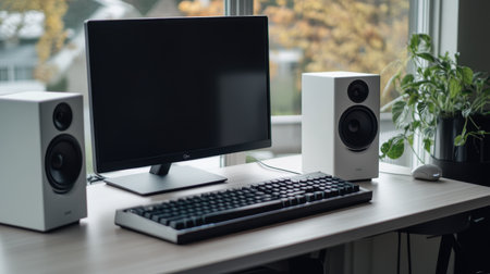 A well-lit interior scene presents a workspace featuring a computer monitor displaying interface elements. Flanking the screen are white speakers. The composition is clean, with a wooden desk and a window providing natural light. The setting suggests a modern office or home environment, potentially suitable for business or technology-related content.