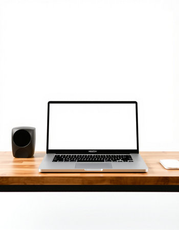 Laptop computer with blank screen on wooden shelf isolated on white background
