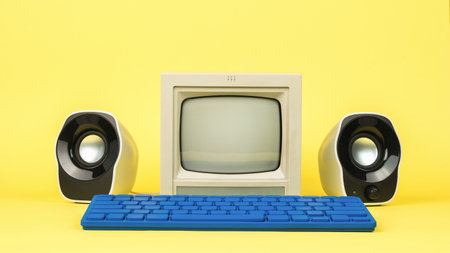 A gray monitor with stylish speakers and a blue keyboard on a yellow background. Stylish vintage equipment.