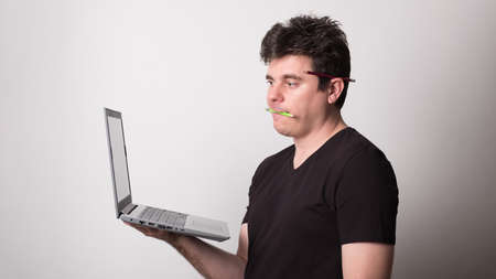Young man using laptop indoors on blue background. Young caucasian man working on laptop.A man sitting on a chair and working on a laptop