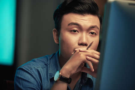 Face of pensive young software developer looking at computer screen searching for bugs in programming code