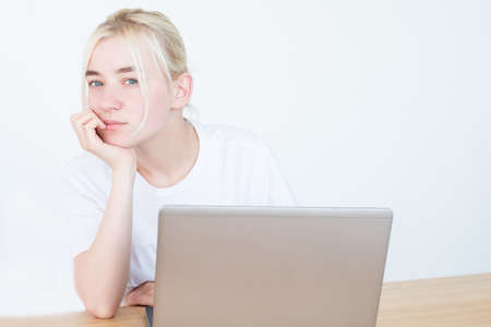 White technological background. Laptop computer on a wooden desk. top view copy space.