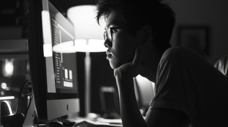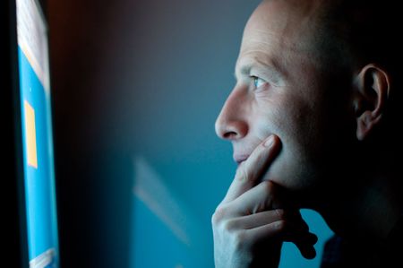 Gambling addicted man with glasses in front of online casino slot machine on laptop computer at night - loosing his money. Dramatic low light grain shot.