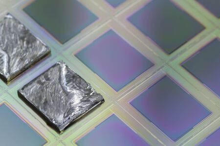 Some microchips have damage like piling film on surface the silicon wafer. Several pieces of wafers with microchips.Rainbow on silicon wafers.Color silicon wafers with glare.