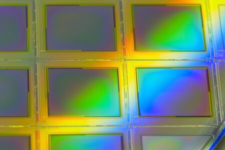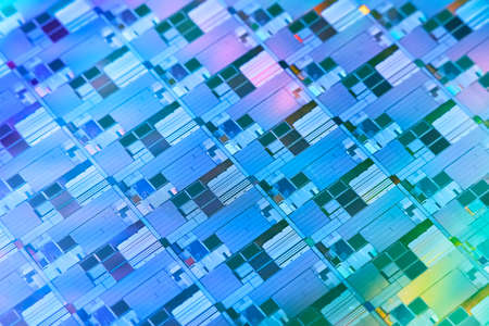 Macro of silicon wafer semiconductor with neon color, integrated circuits to manufacture CPU and GPU