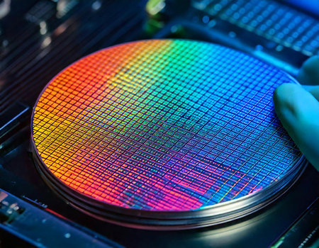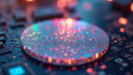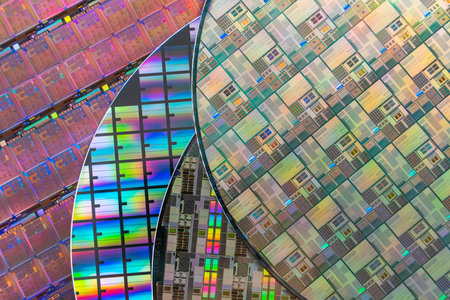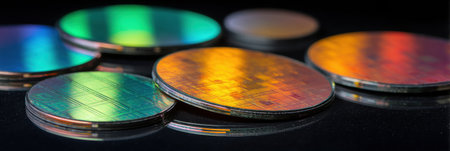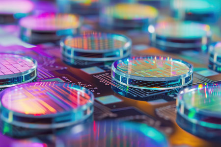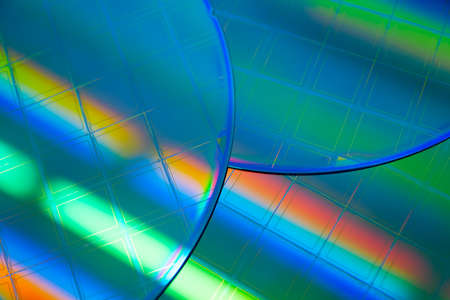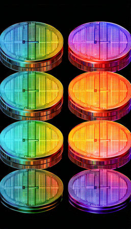 Silicon wafers reflecting vibrant colors, showcasing intricate circuitry and representing advances in computer processing