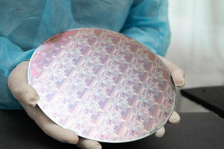Silicon Wafer Under Cleanroom Fabrication in plastic holder box, integrated circuits to manufacture CPU and GPU