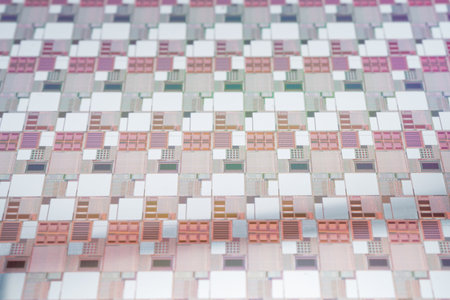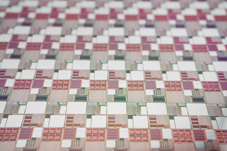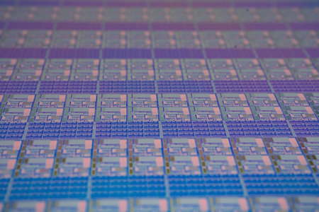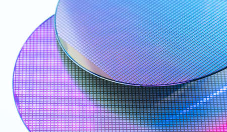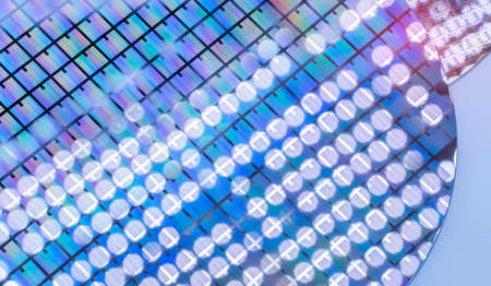 Silicon Wafers with microchips used in electronics for the fabrication of integrated circuits