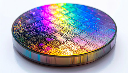 A close-up macro shot of a silicon wafer reveals a mesmerizing rainbow of colors across its surface, where countless microchip dies are precisely etched. This image captures the intricate beauty at the heart of modern technology, symbolizing innovation, processing power, and the future of computing.