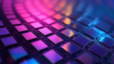 Advanced semiconductor chips are arranged in a meticulous pattern, displaying reflections of vibrant purple and blue hues in a high-tech laboratory environment