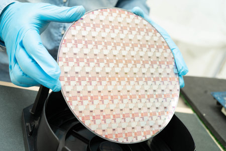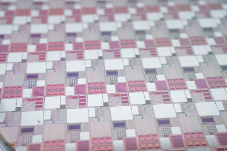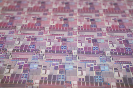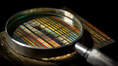 Close-up of nanotechnology microcircuits embedded on a silicon wafer under magnifying lens