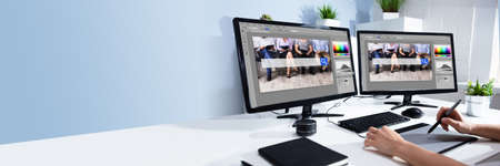 Graphic Designer Artist Working On Multiple Computer Screens