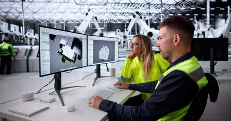 In Factory Workshop: Workers Use High-Tech Industrial CNC Machinery, Robot Arm. Inside Office: Digital Engineering Professional Working on Personal Computer, Designing 3D Component in CAD Software