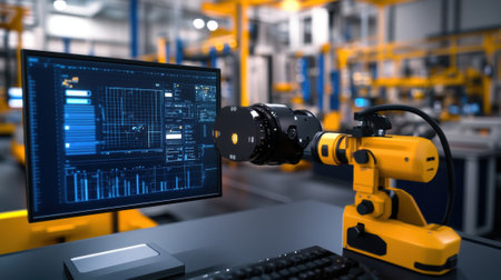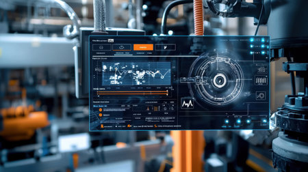 Close-up of a smart factory dashboard with AI-driven analytics, predictive maintenance alerts, and operational efficiency indicators.