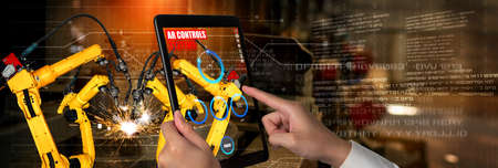 Engineer controls robotic arms by augmented reality industry technology application software. Smart robot machine in future factory working in concept of Industry 4.0 or 4th industrial revolution.