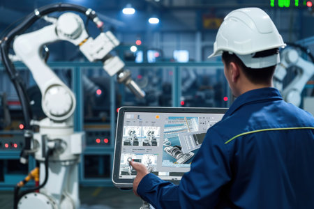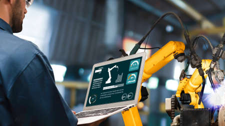 Engineer touching laptop check and control welding robotics automatic arms machine in intelligent factory automotive industrial with monitoring system software. Digital manufacturing operation.Industry 4.0